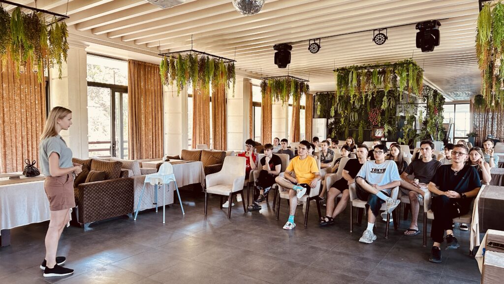 Der Theaterunterricht wurde von Dayana geleitet, einer Moderatorin des BiZ-Instituts für ethnokulturelle Bildung. Wir lernten, die richtige Stimme zu haben, Gefühle zu zeigen und uns auf der Bühne sicher zu fühlen. Bei den Proben wurde immer viel gelacht, alles fand in einer freundlichen Atmosphäre statt. Und am Ende der Schicht gab es eine Aufführung, die eine echte Zierde des Camps wurde.