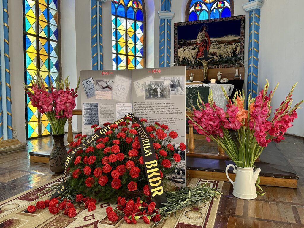 После спектакля мы посмотрели видеосюжет, где нашли отражения воспоминания людей, которые пережили события тех лет, их родных и близких. А в завершение присутствующие возложили цветы к символичной стеле, установленной перед алтарем. Корзина цветов также была возложена от Баварского культурного центра немцев из России (BKDR).